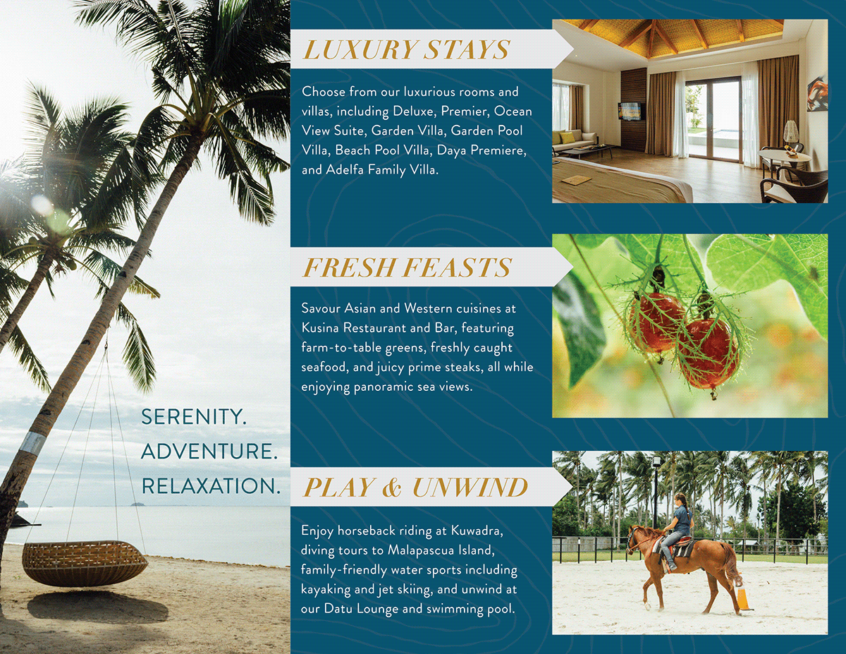 The goal of this project was to create a marketing collateral that effectively showcases the resort’s premium experience. A trifold brochure serves as an informative and portable sales tool, allowing potential guests to explore the resort’s offerings at their own pace.
